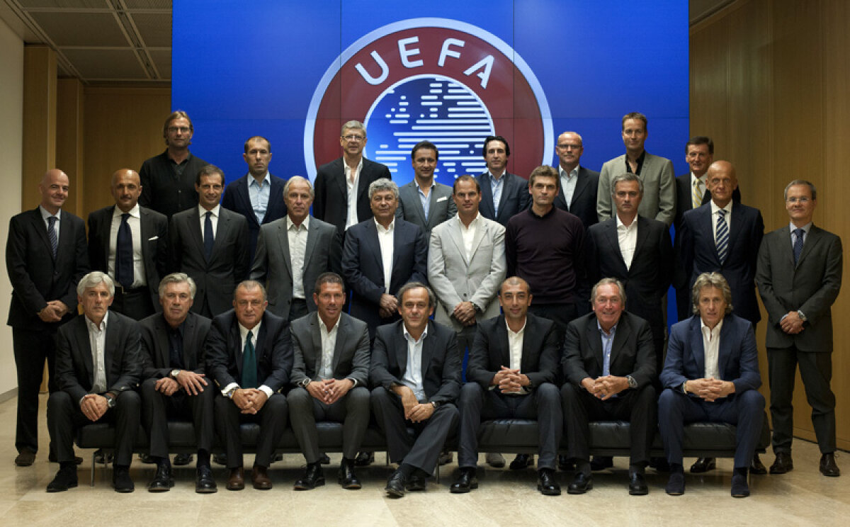 Mircea Lucescu s-a aflat pe o axă selectă la Nyon, încadrat de președintele UEFA, Platini (jos), și de managerul lui Arsenal, Wenger (sus) // Foto: uefa.com
