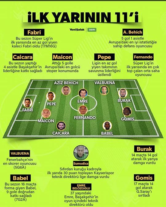 Cum arată primul "11": Fabri (Beșiktaș) - Caicara (Istanbul BB), Maicon (Galatasaray), Pepe (Beșiktaș), Aziz Bechich (Bursaspor) - Fernando (Galatasaray), Emre (Istanbul BB) - Babel (Beșiktaș), Valbuena (Fenerbahce), Burak (Trabzonspor) - Gomis (Galatasaray)