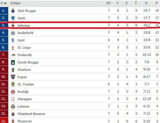 Royal Antwerp e neînvinsă după 7 etape și se situează pe locul 3, cu 15 puncte, la două lungimi de Genk și la 4 de liderul FC Bruges.