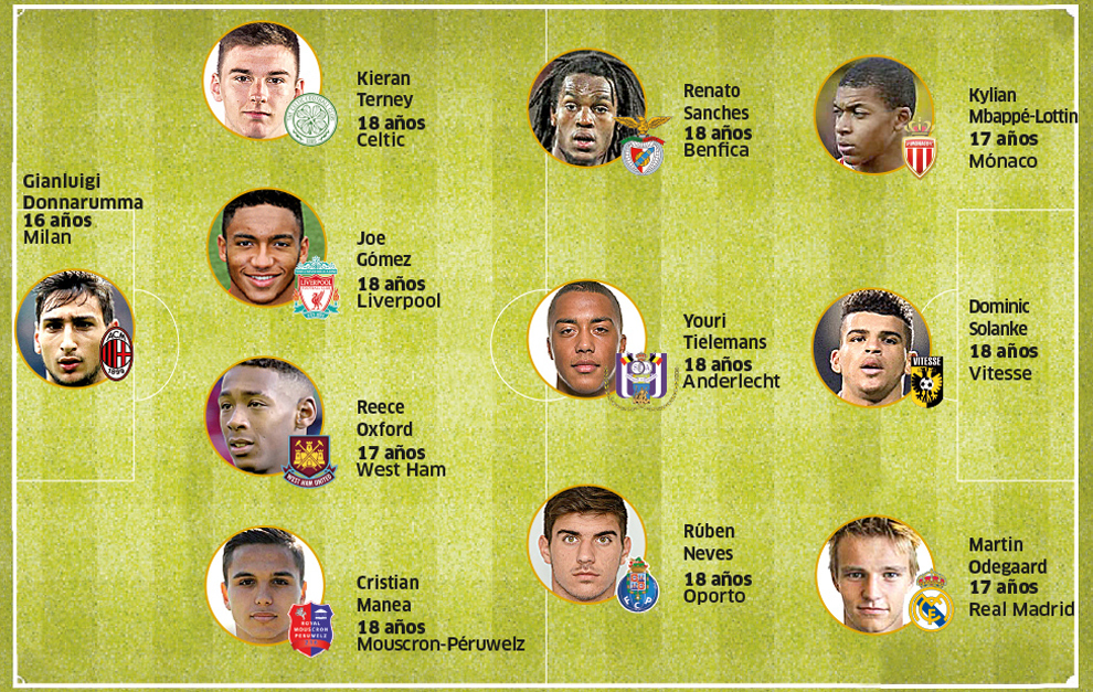 Printre cei 11 jucători selecționați sunt portarul celor de la AC Milan, Gianluigi Donnarumma, 16 ani, Joe Gomez, fundașul de 18 ani al celor de la Liverpool, Renato Sanches, 18 ani, mijlocaș la Benfica, Youri Tielemens, mijlocașul de 18 ani al celor de la Anderlecht, pe care îl vrea Barcelona, și Martin Odegaard, mijlocașul de 17 ani de la Real Madrid.