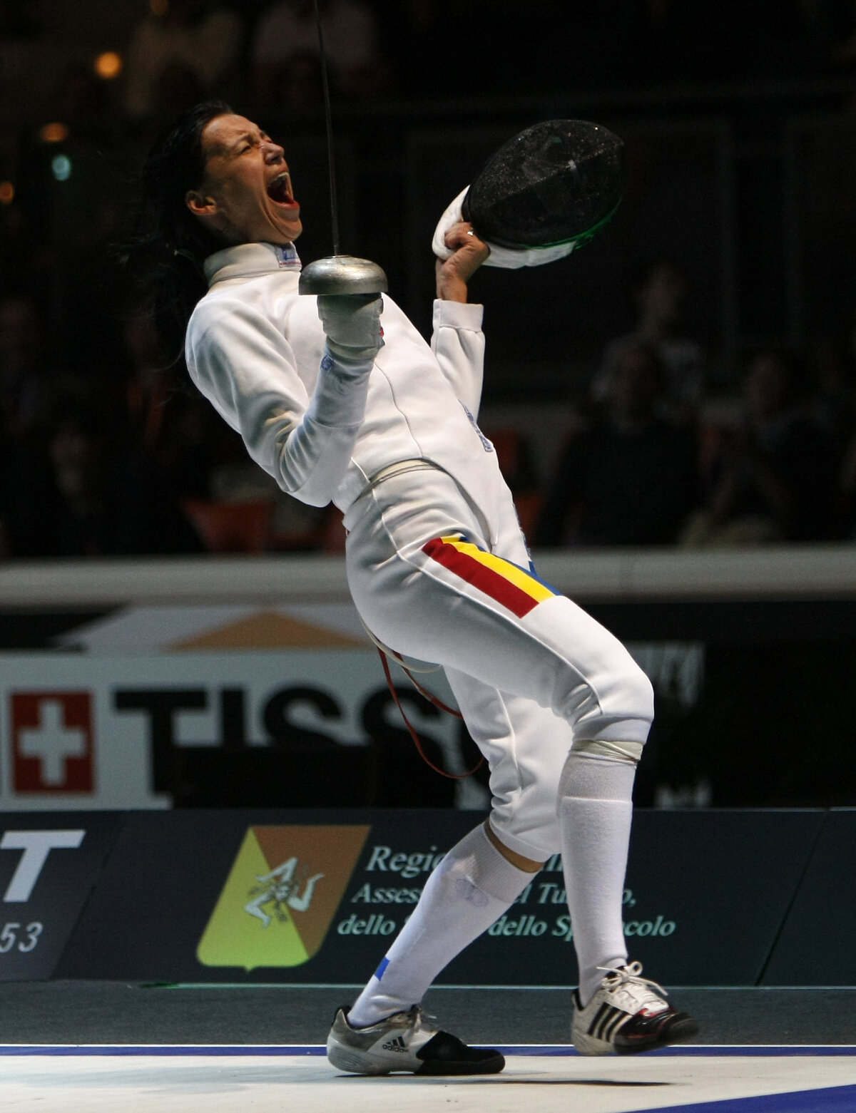 Anca plînge. Se ţine de picior şi plînge. Nu e vorba dspre o accidentare, ci doar o injecţie pentru durerile de spate care au secat-o. Mai tîrziu Simona simte că nu se mai poate ţine pe picioare. E în mijlocul asaltului cu suedeza Gars. Vin medicii, i se ia tensiunea. E roşie la faţă şi dă din cap. Apă, gheaţă, cafea. Totul ca să-şi revină. Şi îşi revine. Deşi era condusă, "Simi" a întors meciul şi s-a calificat în "optimi". La final, cînd îşi scoate masca roşie, e palidă şi abia se mai ţine pe picioare. Anca a mers şi ea în "optimi" după ce a învins-o pe unguroaica Toth. În sală e deja cald. Pe balustrade stau costume la uscat. Se transpiră la unison. Pe pista roşie, Simona o întîlneşte pe elveţianca Geroudet. Simi se mai opreşte din cînd în cînd, trăgîndu-şi sufletul. Se termină 15-10, iar apoi, după cîteva minute, întinsă pe scaunele din tribune, întreabă: "A fost 15-10? Credeam că era mai strîns". Anca umple cu strigătul său sala. Ţipăt după ţipăt şi tuşă după tuşă pentru o calificare în "sferturi" obţinută cu o găleată de transpiraţie.