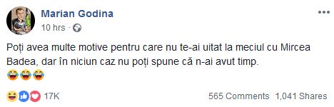 Cunoscutul polițist Marian Godină l-a ironizat pe Badea prin intermediul unei postări apărute pe pagina sa de Facebook. „Poți avea multe motive pentru care nu te-ai uitat la meciul cu Mircea Badea, dar în niciun caz nu poți spune că n-ai avut timp”, a scris Godină, postarea sa strângând aproape 20.000 de like-uri.