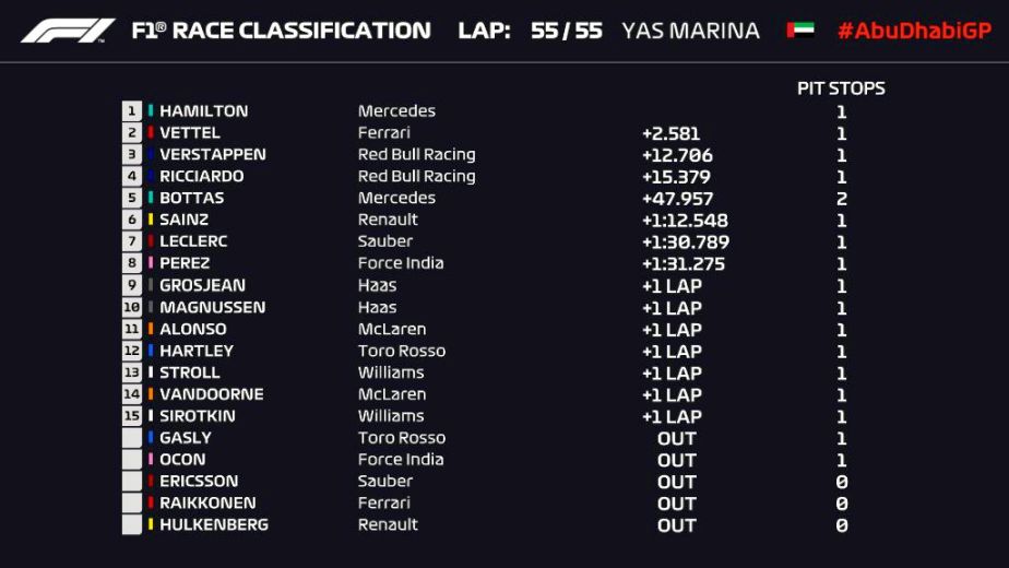 Al 11-lea pole-positon al sezonului a fost încununat de Lewis Hamilton cu o victorie în Marele Premiu de la Abu Dhabi, ultima cursă a sezonului.