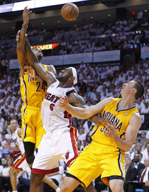 Dramatism de două oriPacers conducea cu 102-101, după ce Dwayne Wade l-a faultat pe Paul George, iar ultimul a înscris de trei ori de la linia de libere. Mai erau două secunde de joc. Iar "The King" James şi-a asumat responsabilitatea atacului, a preluat mingea, a intrat furtunos în "căciulă" şi-a marcat două puncte, ale victoriei, chiar de lîngă George! Acelaşi care a dus meciul în prelungiri, după un coş în ultima secundă a timpului regulamentar de joc! LeBron a reuşit a triple-double, 30 de puncte, 10 recuperări, 10 pase decisive. Şi colegii săi l-au urmat, fără menajamente. Wade, 19 puncte, Bosh, 17 puncte, Andersen, 16 puncte, Chalmers, 10 puncte, cu toţii au pus umărul la victorie.