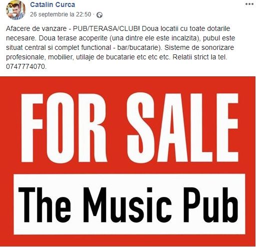 "Afacere de vânzare – PUB/TERASĂ/CLUB! Două terase acoperite (una dintre ele este încălzită), pubul este situat central și complet funcțional – bar/bucătarie). Sisteme de sonorizare profesionale, mobilier, utilaje de bucătarie etc. etc. etc", sună anunțul publicat de Cătălin Curcă pe contul său de Facebook.
