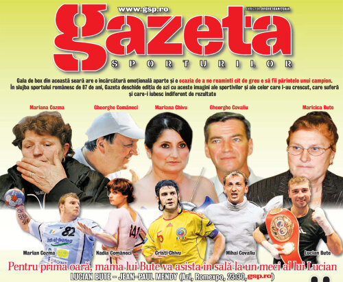 Gala de box din această seară are o încărcătură emoţională aparte şi e ocazia de a ne reaminti cît de greu e să fii părintele unui campion. În slujba sportului românesc de 87 de ani, Gazeta a deschis ediţia tipărită de azi cu o pagină 1 specială. În locul clasicelor îndemnuri la victorie, Gsp a ales o copertă emoţionantă, ilustrată cu aceste imagini ale sportivilor şi ale celor care i-au crescut, care suferă şi care-i iubesc indiferent de rezultate.
