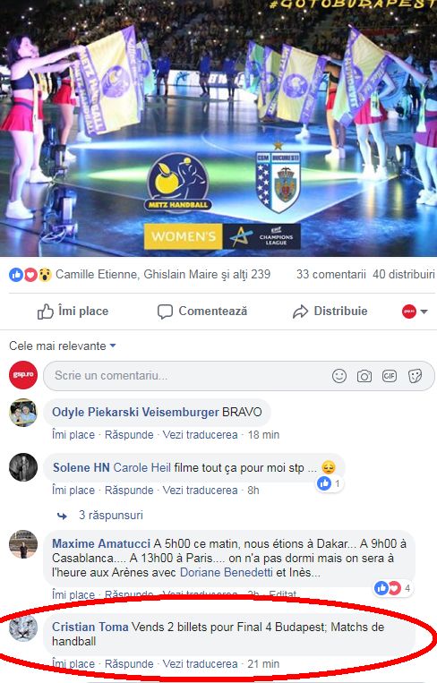 CSM București a pierdut returul „sferturilor” Ligii Campionilor cu Metz, scor 22-23, și a ratat calificarea în Final Four-ul de la Budapesta. Un fan român a fost extrem de prompt și a postat un comentariu pe pagina de Facebook a franțuzoaicelor imediat după meci.