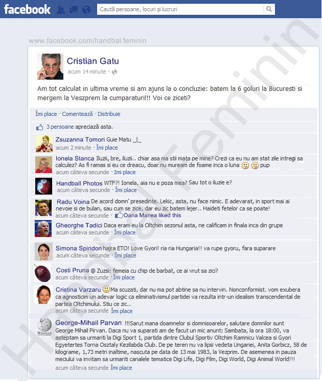 Tot dialogul e unul fictiv, dar e savuros. Cristian Gaţu, preşedintele FRH, e cel care postează primul şi cere opinia altor fani. "Am tot calculat în ultima vreme şi am ajuns la o concluzie: batem la 6 goluri la Bucureşti şi mergem la Veszprem la cumpărături!".