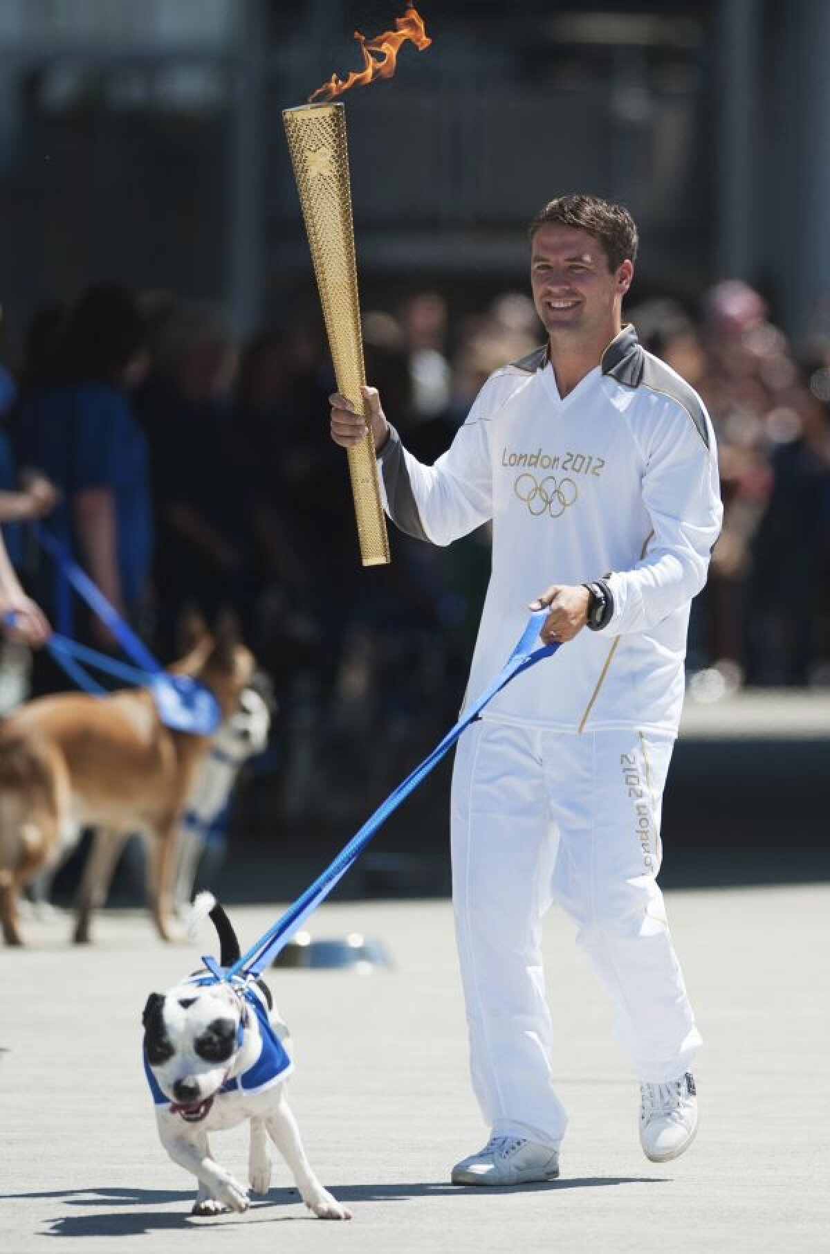 : Alături de un patruped haios Fostul fotbalist englez Michael Owen a purtat torţa olimpică într-o mînă. Cu cealaltă l-a ţinut în lesă pe Rory, un cătel aflat într-un centru de adopţii pentru animale.