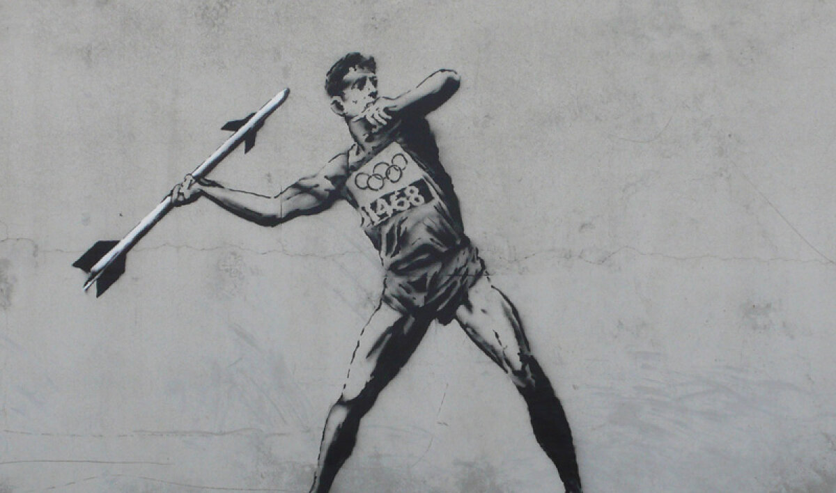 : Sport pe ziduri Artistul urban Bansky a omagiat Olimpiada de la Londra în felul său ciudat şi creativ. Acestea sunt două dintre operele sale.