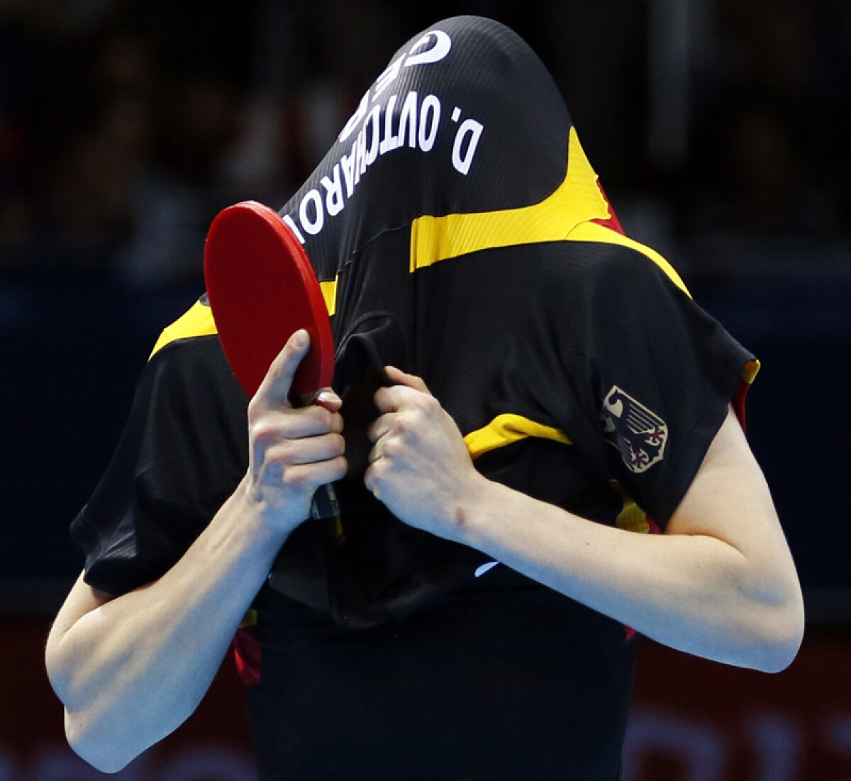 : Cine este aici? Este germanul Dimitri Ovcearov, bucurîndu-se după victoria din sferturile competiţiei de tenis de masă, în faţa danezului Michael Maze