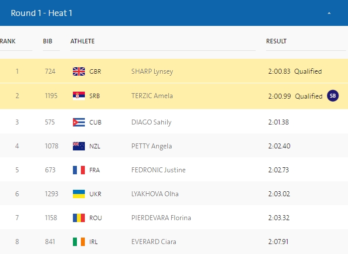 Florina Pierdevară a încheiat cursa din calificările probei pe poziția a șaptea și a ratat accedarea în semifinale. Sportiva a terminat prima serie cu timpul 2:03:32.