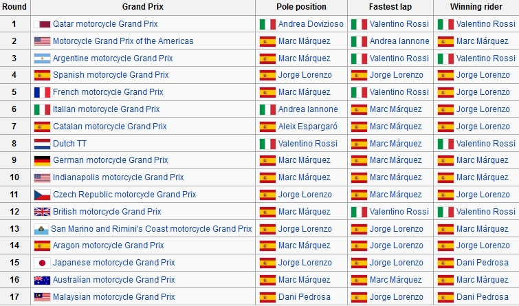 Astfel, Rossi a fost singurul care a spart monopolul curselor câștigate de spanioli. Au mai punctat Andrea Iannone cu cel mai rapid tur în SUA și Andrea Dovizoso cu primul loc pe grila de start în Qatar. De cealălată parte, spaniolii au atacat prin rideri ca Jorge Lorenzo, Marc Marquez, Dani Pedrosa și Aleix Espargaro.