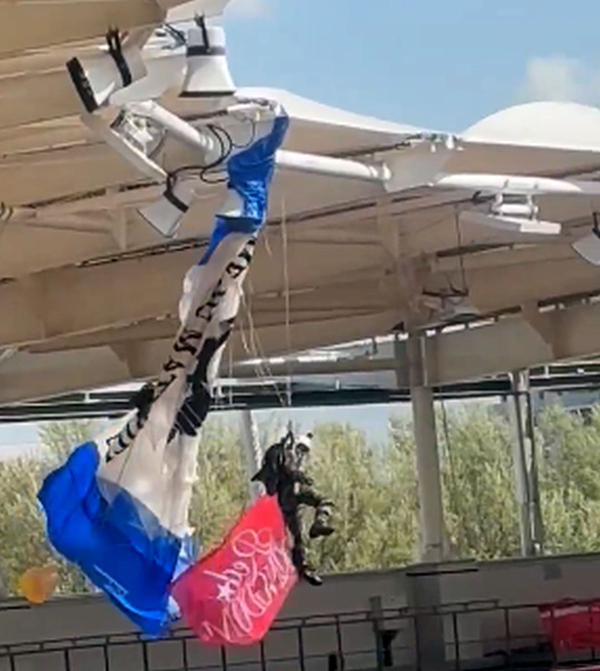 Scene uluitoare: parașutistul a rămas atârnat de acoperișul stadionului din Franța! Meciul a fost întârziat