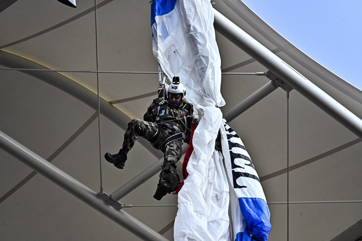 Scene uluitoare: parașutistul a rămas atârnat de acoperișul stadionului din Franța! Meciul a fost întârziat