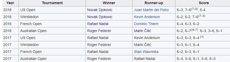 Dacă privim și spre 2017, în circuitul masculin Roger și Rafa și-au împărțit egal turneele de Mare Șlem, în timp ce la feminin au existat patru jucătoare diferite care s-au impus: Serena Williams (16 WTA), Jelena Ostapenko (10 WTA), Garbine Mugurza (14 WTA) și Sloane Stephens (9 WTA).
