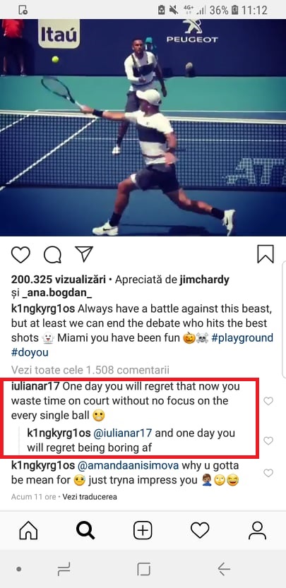 La finalul partidei, australianul Kyrgios a postat pe Instagram un clip cu punctul de senzație reușit pe parcursul primului set și, așa cum se întâmplă în majoritatea situațiilor, australianul a fost asaltat de comentarii venite din partea fanilor.