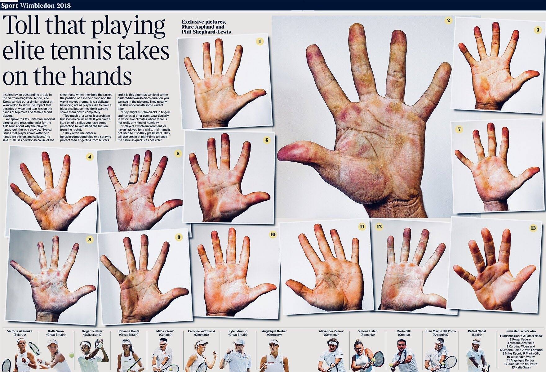 Înainte de a doua săptămână de la Wimbledon, englezii de la The Times au făcut un colaj cu palmele jucătorilor de la Wimbledon. Printre jucători se numără Simona Halep, Rafa Nadal, Roger Federer, Victoria Azarenka, Angelique Kerber sau Caroline Wozniacki.