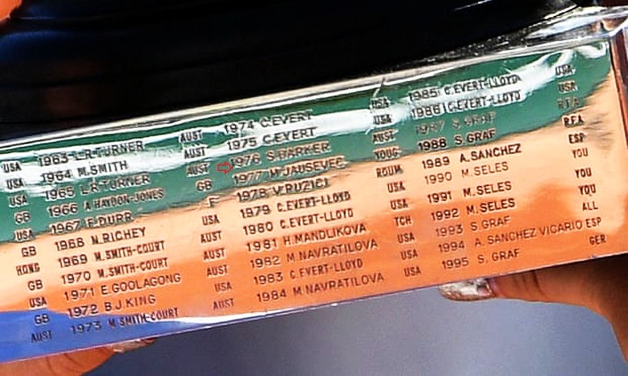Fotografii care au avut prilejul de a imortaliza zeci de cadre cu trofeul feminin au putut observa că naționalitatea lui Sue Barker, ultima jucătoare britanică ce s-a impus în competiția feminină de la Roland Garros, este gravată in mod eronat pe trofeu, unde apare că ar fi reprezentat Australia.