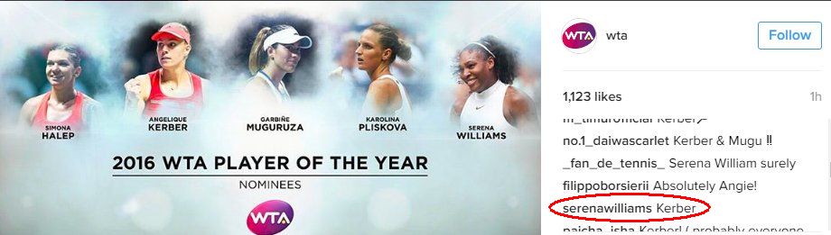 Pe contul oficial de Instagram al WTA a fost publicată o fotografie cu numele celor cinci jucătoare nominalizate: Simona Halep, Serena Williams, Angelique Kerber, Garbine Mugurza şi Karolina Pliskova.