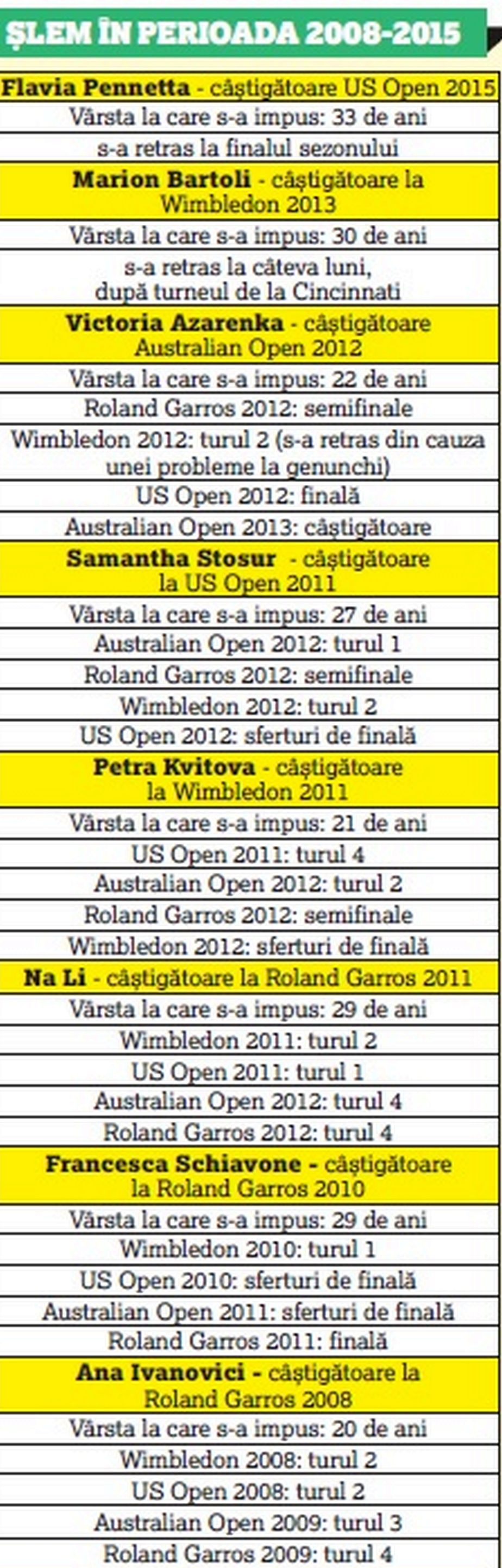 Dacă mai coborâm puțin în timp, până în 2008, alte opt jucătoare au reușit să câștige pentru prima oară în carieră un turneu de Mare Șlem. Unele au rămas cu acel singular triumf, în timp ce altele l-au dublat, dar niciuna nu a trecut de cifra 2.