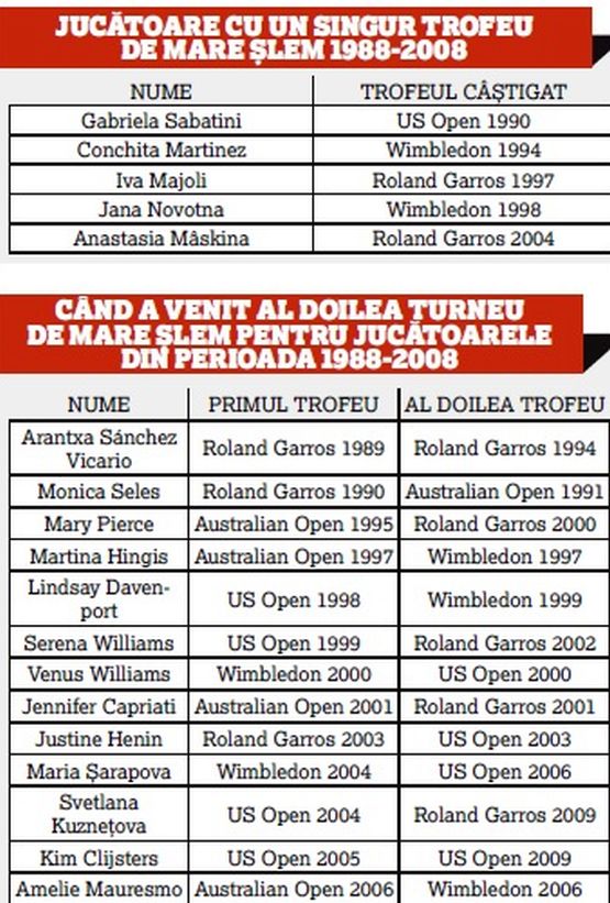 Dacă mai derulăm douăzeci de ani din istoria tenisul feminin vom găsi optsprezece jucătoare care au reușit să câștige primul lor trofeu de Mare Șlem în perioada 1988-2008. Dintre ele, 13 au reușit să mai trăiască fericirea supremă, celelalte cinci rămânând doar cu o singură copie în miniatură a vestitelor trofee.