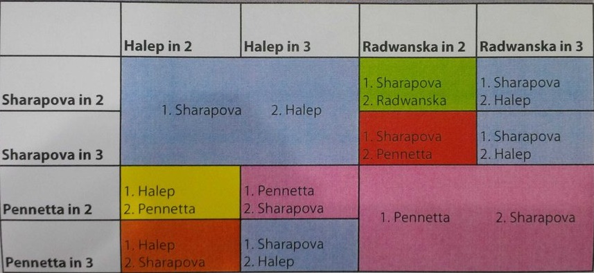 Pentru a fi sigură de calificare, Halep trebuie să cîștige meciul cu Agnieszka Radwnaska în două seturi. Astfel, pentru româncă nu ar mai conta rezultatul meciului Șarapova - Pennetta.