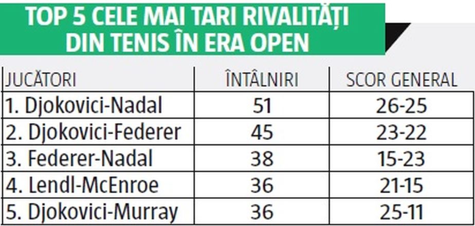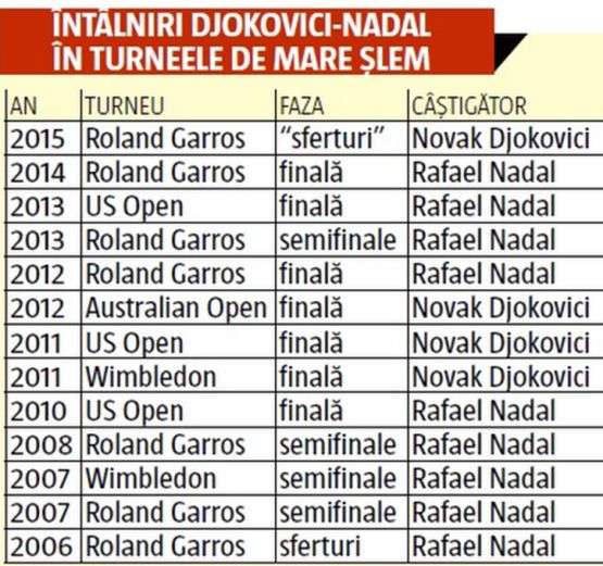 Nole și Rafa s-au mai întâlnit anul acesta o singură dată, pe zgură, la Roma, învingător ieșind spaniolul. Dintre cele 51 de confruntări de până acum, 13 au fost în turnee de Mare Șlem: șapte finale, patru semifinale și două "sferturi".