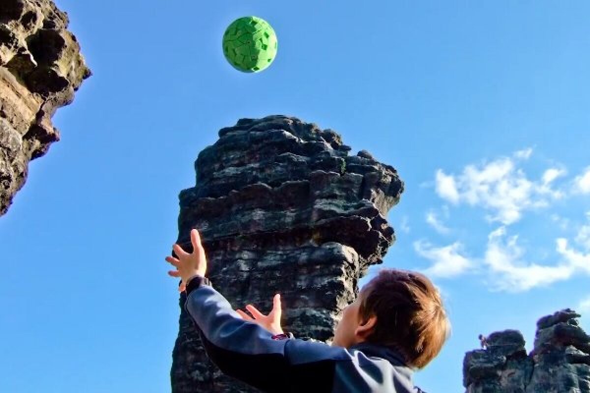 Creaţia a cinci developeri de la Computer Graphics Group în Berlin, mingea panoramică verde este dotată cu 36 camere de telefon mobil de 2 megapixeli, fiecare preluând automat câte un unghi din imaginea formată când atinge cel mai înalt punct din aruncare.